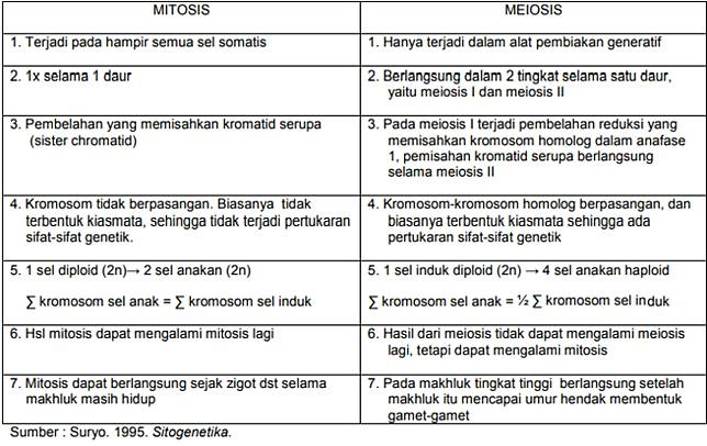 Dari gambar tersebut proses pembelahan sel antara mitosis dan meiosis terlihat hampir sama, namun keduanya sebenarnya berbeda dalam hal tujuan dan hasil akhir. Pada artikel sebelumnya kita sudah membahas pembelahan sel secara mitosis dimana pada pembelahan sel secara mitosis akan menghasilkan sel anak dengan jumlah kromosom sama seperti induknya, yaitu 2n. Berikut adalah beberapa ciri dari pembelahan meiosis: Sel bermitosis menghasilkan sifat yang mirip dan membuat tubuh manusia tumbuh. Tempat terjadinya mitosis dan meiosis.